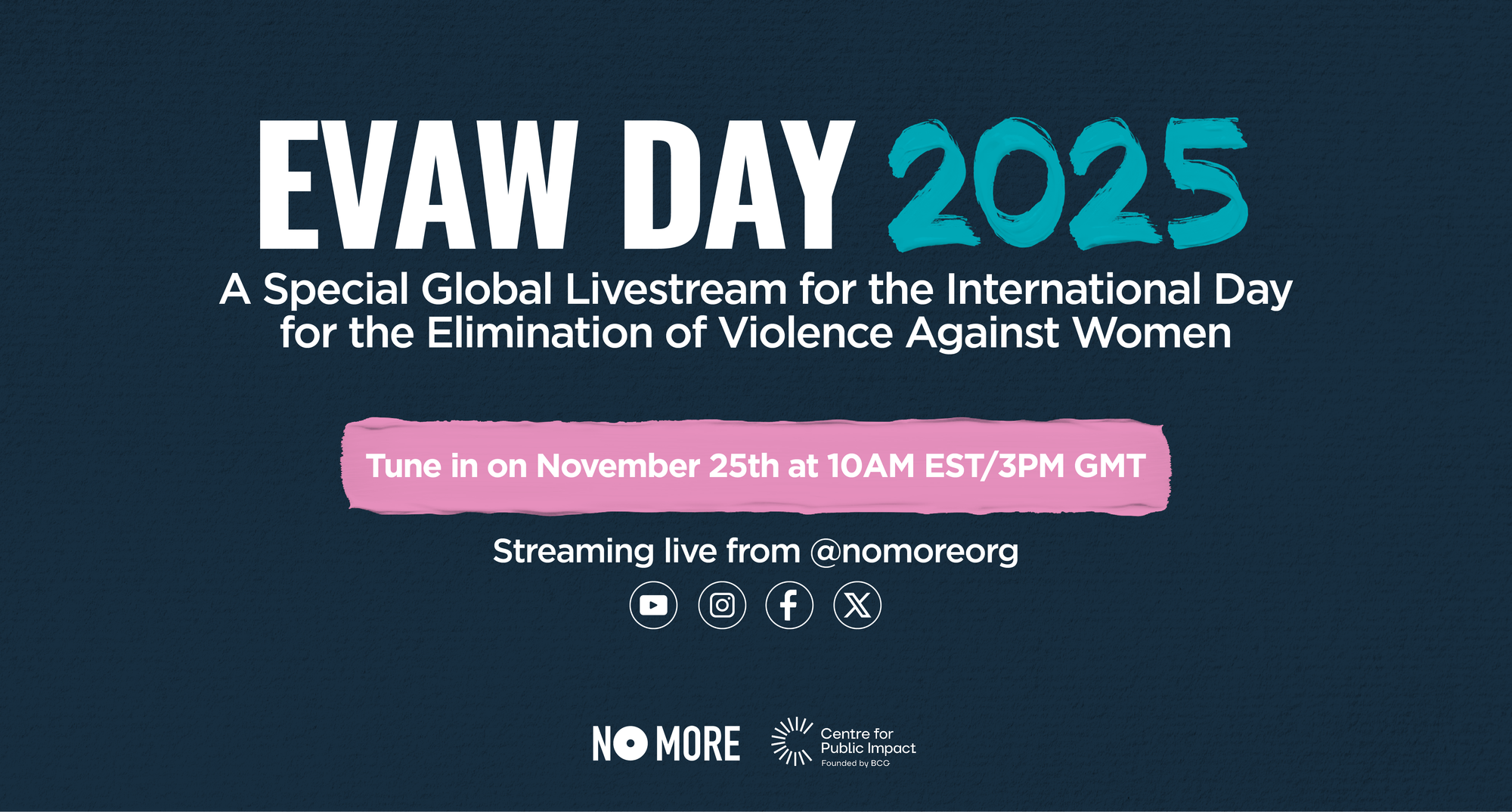 Violence against women and girls is one of the world's most urgent and widespread human rights crises. To commemorate the International Day for the Elimination of Violence Against Women (EVAW Day) on November 25th, NO MORE is partnering with the Centre for Public Impact to bring you a global livestream uniting voices from around the world to mobilize action to end gender-based violence.