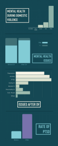 - After domestic violence, the highest reported mental health issues were PTSD: 67%, Anxiety: 64%, and Depression: 54%. Cases of PTSD went up by 233%.